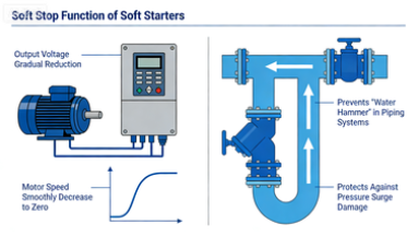 一些软启动器具有“软停止”功能。收到停止命令后,该设备逐渐降低输出电压,使电机速度平稳减速至零,而不是仅仅依靠自然滑行。这一特性对于防止流体输送管道中的“水锤”效应至关重要,从而有效保护管道系统免受压力波动造成的损坏。