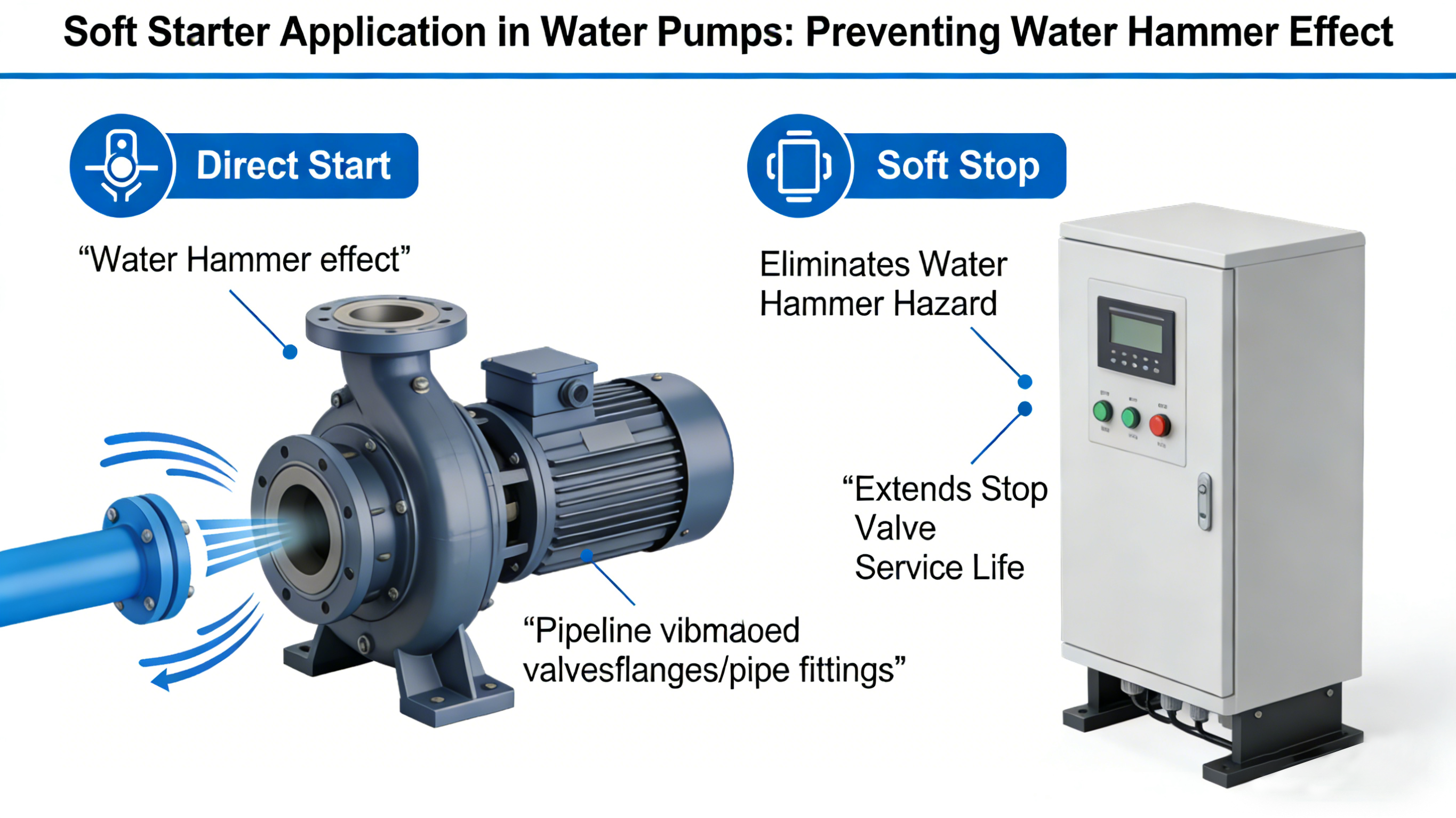 泵系统代表了软启动器最典型和最广泛的应用领域。离心泵直接启动时,转速急剧升高,引起管道内液体流速突变,产生“水锤效应”。在轻微的情况下,这会引发管道振动;严重时会导致阀门、法兰、管件损坏。软启动器的软停止功能保证了水泵在停机过程中平稳减速,从而从根本上消除了水锤的危害,延长了截止阀的使用寿命。
