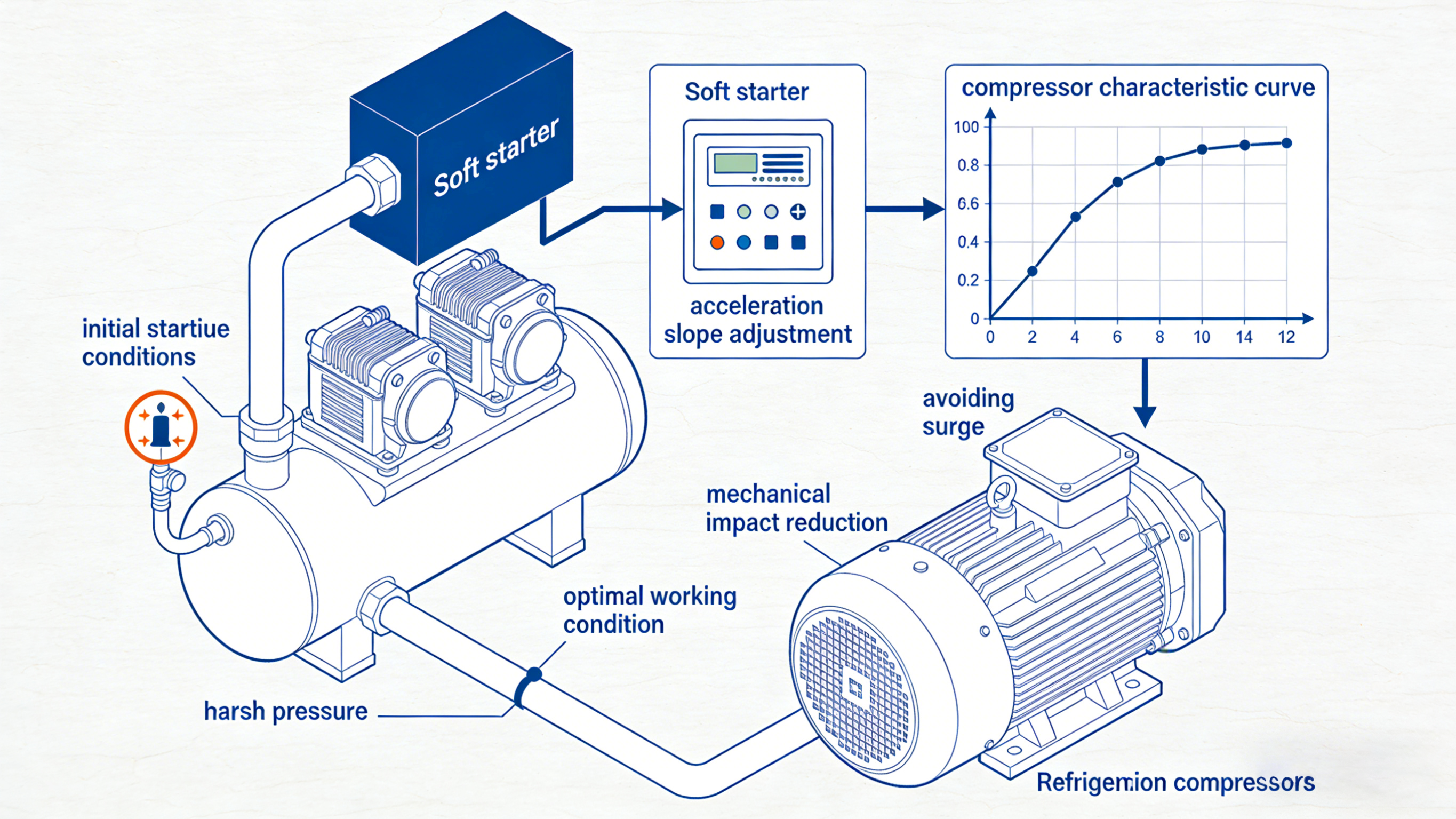 空气压缩机和制冷压缩机通常面临苛刻的启动条件,因为它们在开始运行时必须克服管道背压。软启动器允许根据压缩机的特定特性曲线精确配置初始扭矩和加速斜坡率。这可确保压缩机在最佳运行条件下完成启动过程,从而防止喘振和机械冲击。