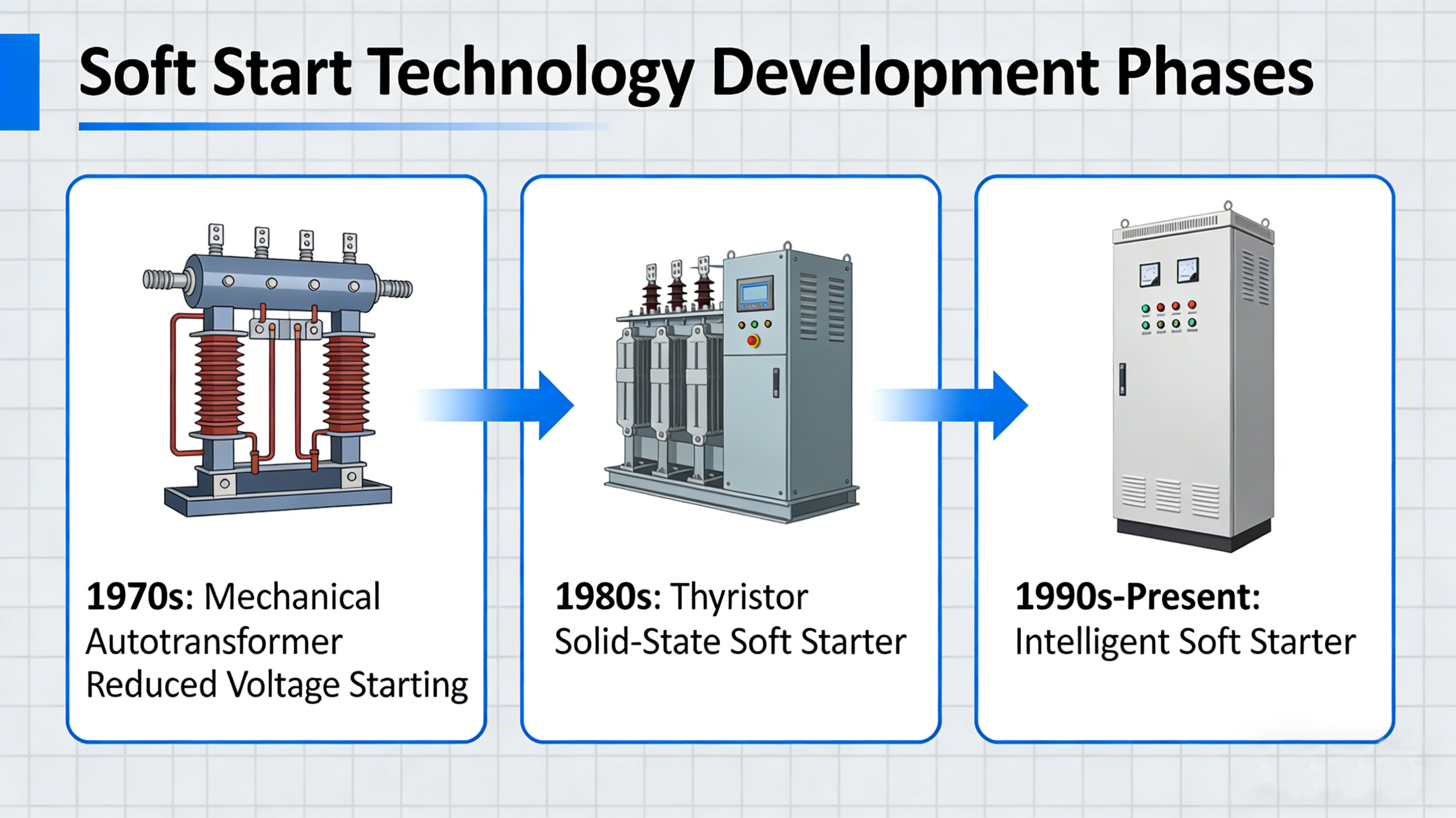 - 第二阶段(1980年代):晶闸管半导体器件的成熟为真正的固态软启动器的出现铺平了道路,实现了电机启动过程中连续无级的电压调节过程。