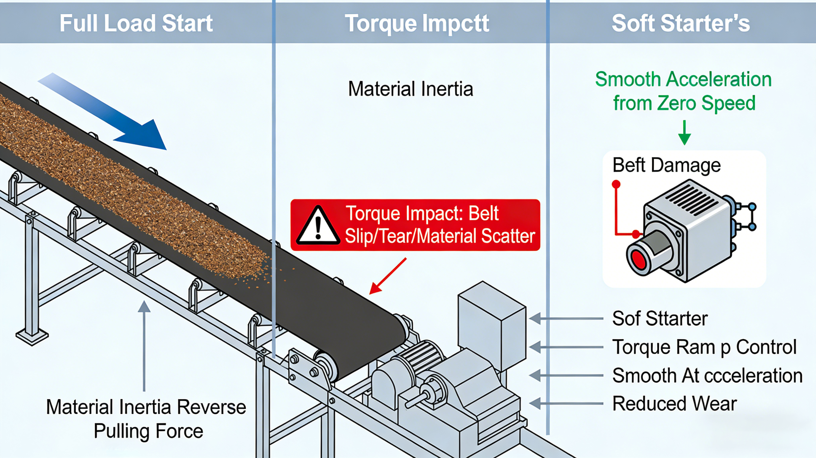 当输送系统满载启动时,被输送物料的惯性会产生巨大的反张力。直接启动产生的扭矩冲击会导致皮带打滑、撕裂,甚至物料溢出。软启动器的扭矩斜坡控制功能可确保输送机从零速平稳加速,从而显着减少输送带和驱动部件的磨损。