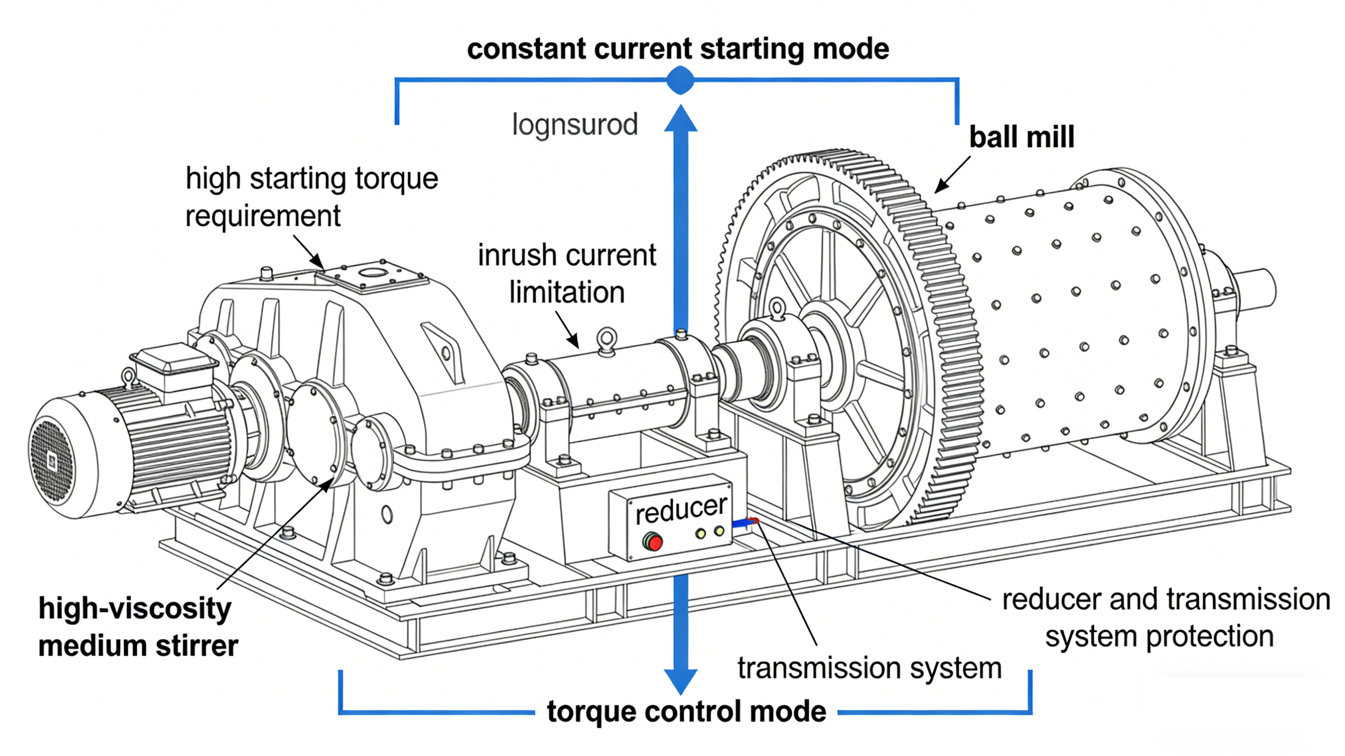 对于重型机械(例如处理高粘度介质的搅拌机或球磨机),对启动扭矩的要求非常高。此类应用需要采用恒流启动和扭矩控制模式的组合方法。这一策略确保提供足够的启动扭矩,同时有效限制浪涌电流,从而保护变速箱和整个传动系统。