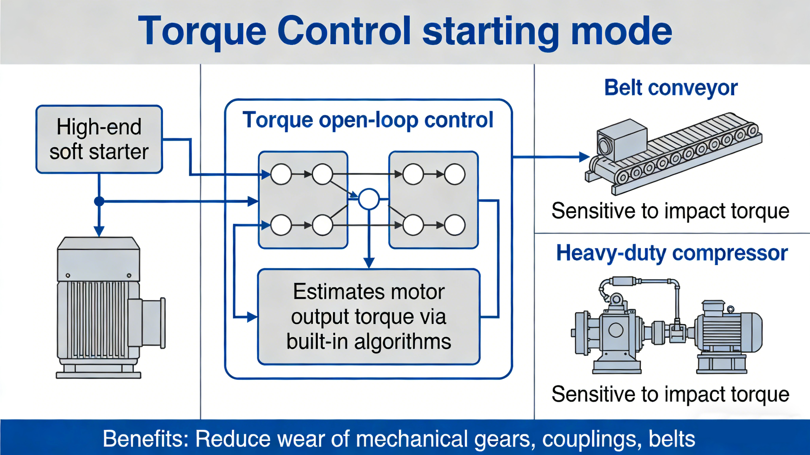 高端软启动器具有开环转矩控制功能;利用内置算法来估计电机的输出扭矩,它们有助于实现以近似恒定扭矩为特征的平稳启动过程。这种模式对于对扭矩冲击敏感的机械负载(例如传送带和重型压缩机)特别有利,因为它可以有效地最大限度地减少机械齿轮、联轴器和皮带的磨损。
