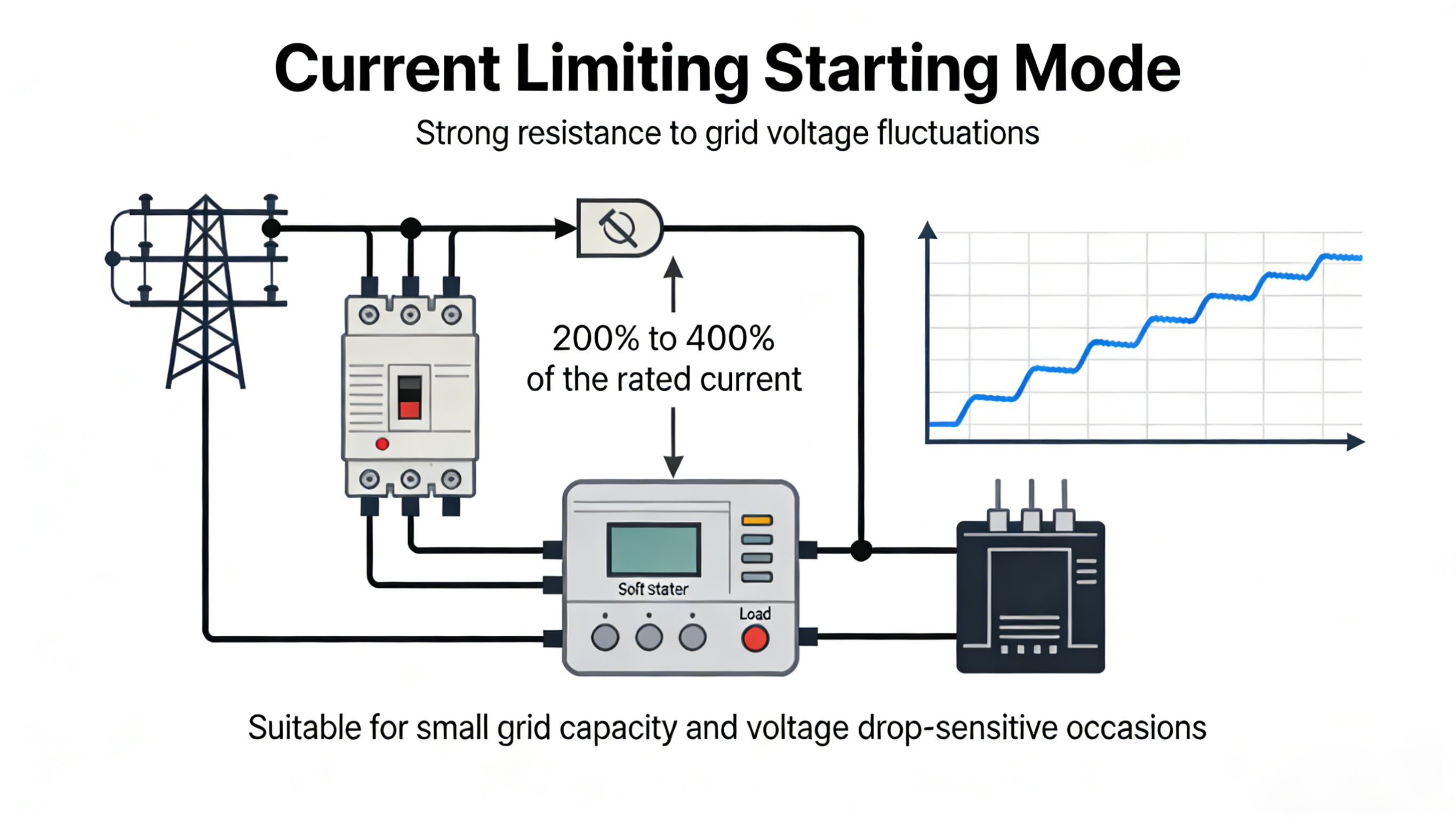 通过闭环电流反馈控制,软启动器将启动电流严格限制在指定的设定点内(通常为额定电流的200%至400%),从而实现恒定电流斜坡上升曲线。该模式对电网电压波动具有很强的抵抗能力,特别适合容量有限或对电压暂降敏感的电网应用。